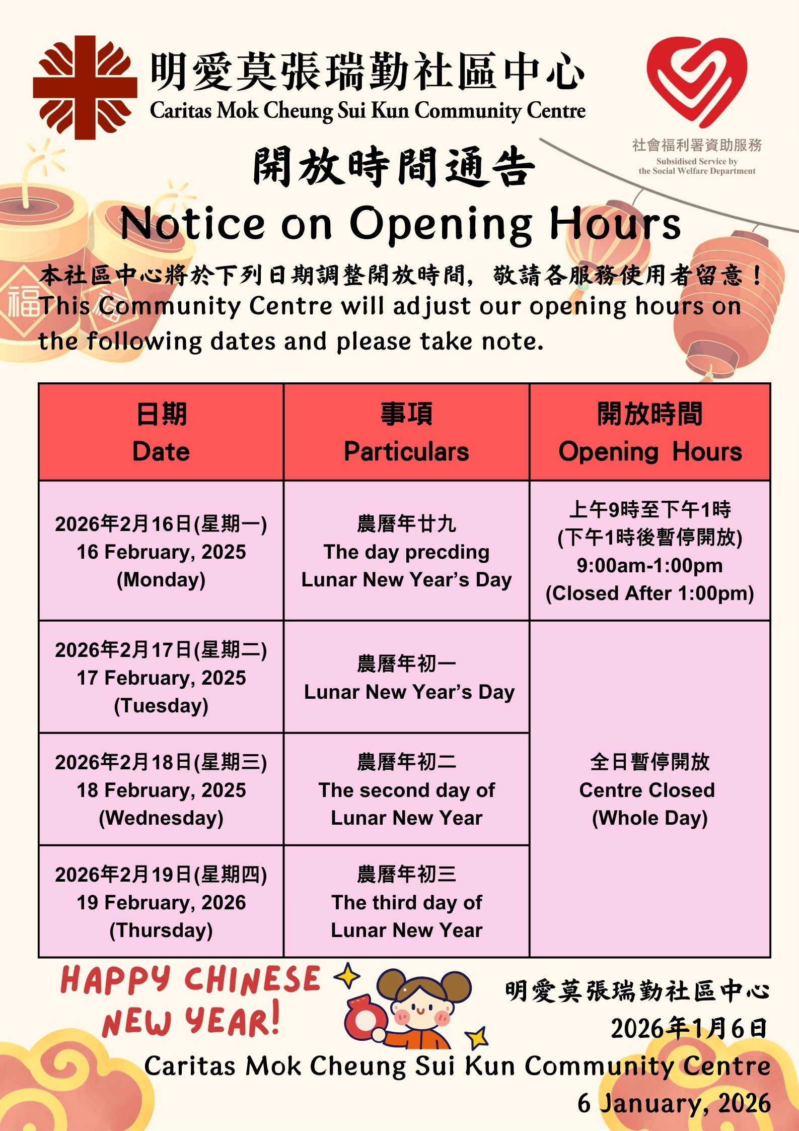 開放時間通告 Notice on Opening Hours (16/2/2026-19/2/2026)